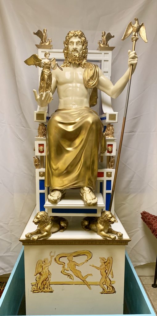 3D reproduction of the Statue of Zeus at Olympia. The Statue of Zeus at Olympia, considered one of the Seven Wonders of the Ancient World, was completed circa 435 BCE. Commissioned by Pericles of Athens and created by his good friend Phidias of Athens, the Statue of Zeus stood more than 40 feet tall and depicted the king of the Olympian gods seated on his throne, with his staff in one hand - his eagle perched atop it - and Nike, the goddess of victory, standing on his other hand. Despite being constructed from gilded wood and ivory, the statue stood until the 5th century CE, and was regarded as the finest statue of Zeus that the Mediterranean world had ever seen. This replica of the statue stands at 6 feet tall - the approximate height of Nike in the original - with the throne made from wood and Zeus, Nike, Zeus’s eagle, and the other high-detail pieces being 3D printed.
